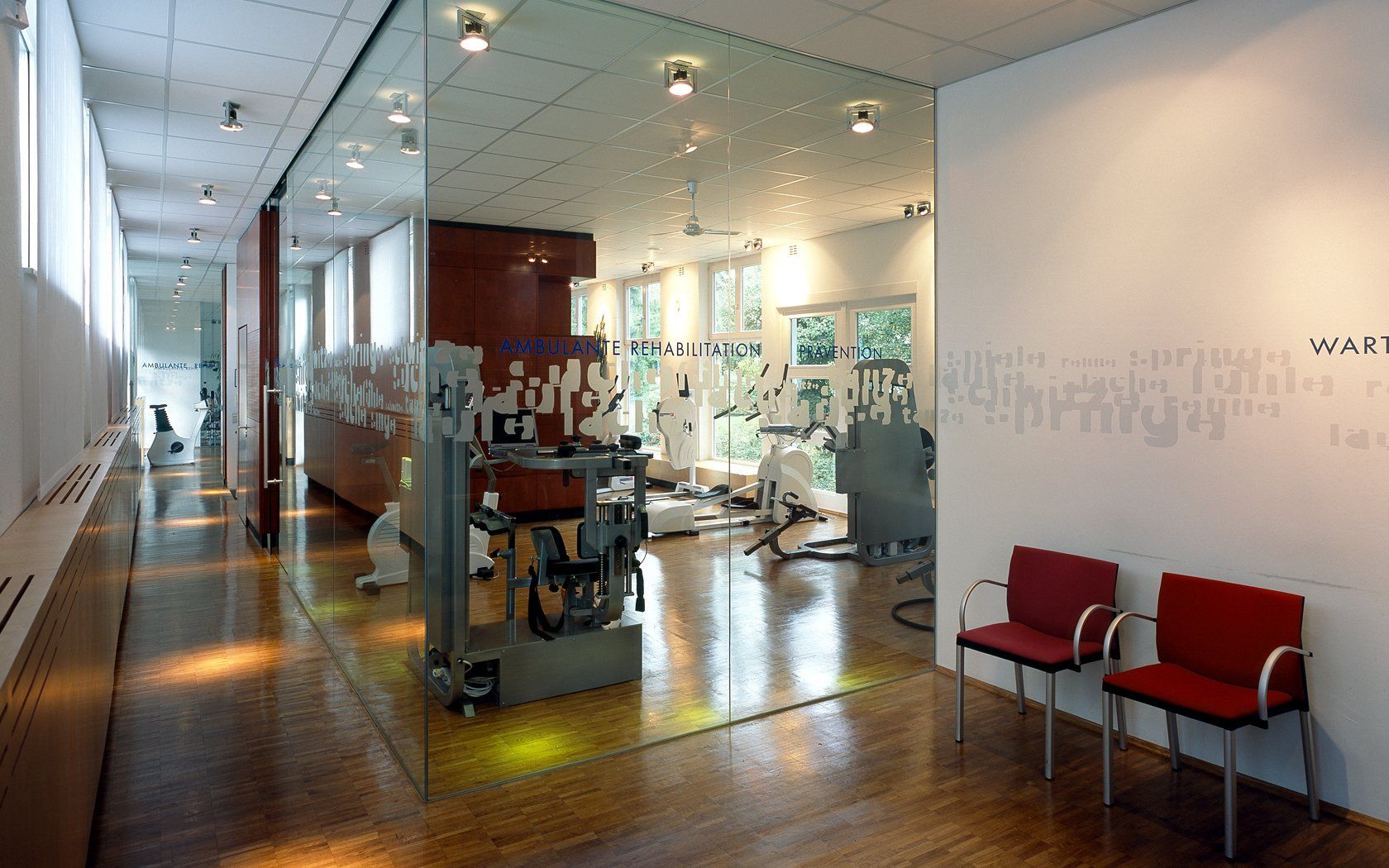 Im ersten Bauabschnitt wurden der Eingangsbereich, die Kraft- und Therapieräume und der Massagebereich umgebaut und räumlich und gestalterisch durch Belichtung und Farben aufgewertet.